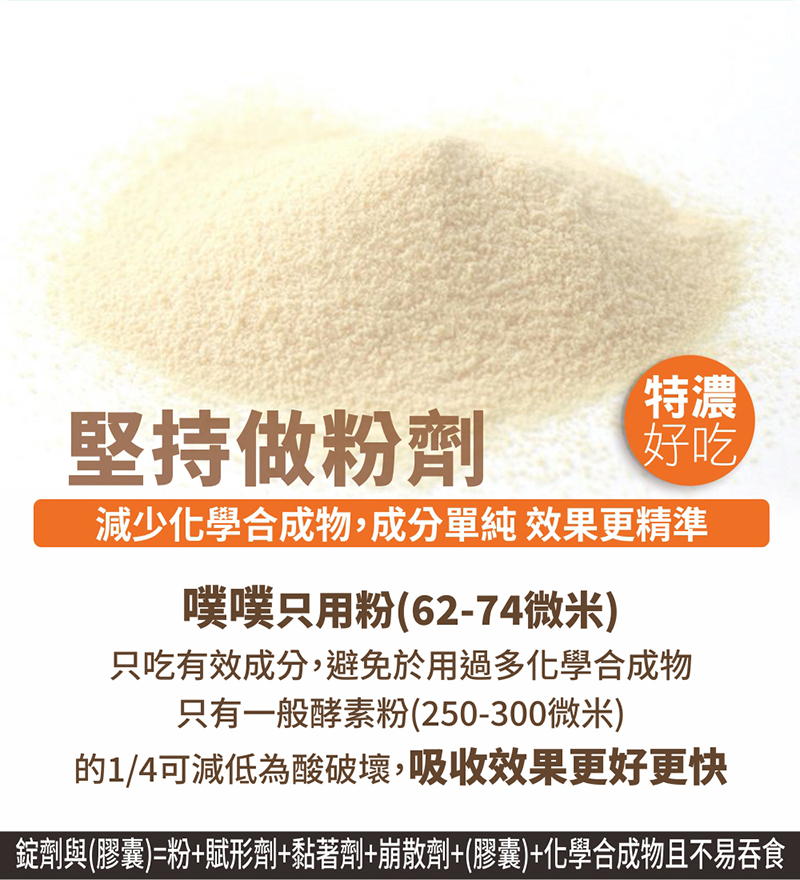 Lactose 乳醣、FOS 果寡糖、Yogurt powder 優格粉、Plant comprehensive enzymes植物綜合酵素(maltodextrin麥芽糊精, amylolytic enzyme澱粉分解酵素, proteolytic enzyme蛋白分解酵素, lipolytic enzyme脂肪分解酵素, cellulolytic enzyme纖維分解酵素, pineapple fruit鳳梨果實, carrot胡蘿蔔, coix seed薏苡仁, gorgonian芡實, seaweed紫菜)、Apple Mixed Juice Powder 蘋果綜合果汁粉 (Composite Apple Juice Concentrate綜合蘋果濃縮汁, Maltodextrin麥芽糊精, Citric Acid檸檬酸, Flavor香料)、Marine Magnesium (Natural Seawater Mineral Extract) 海洋鎂 (天然海水礦物質提取)、Lactobacillus rhamnosus B5K1 雷曼氏乳酸桿菌、L paracasei 副乾酪乳酸桿菌、L plantarum 胚芽乳酸桿菌、L acidophilus BB5 嗜乳酸桿菌、L salivarius 唾液乳酸桿菌、Bifidobacterium longum 龍根菌、L fermentum 發酵乳桿菌、Streptococcus thermophilus ST1 嗜熱鏈球菌、Lactococcus lactis subsp. Lactis 雷特氏乳球菌、Bifidobacterium bifidum 比菲德氏菌、脫脂奶粉、Streptococcus thermophilus ST1, Streptococcus thermophilus, Lactococcus lactis subsp. Lactis rett,Bifidobacterium bifidum, skimmed milk powder) 甜橙萃取、Sweet Orange Extract 芭樂葉萃取、Guava Leaf Extract 山竹萃取、Mangosteen Extract 專利香檬汁粉、(香檬汁精萃取粉、麥芽胡精)