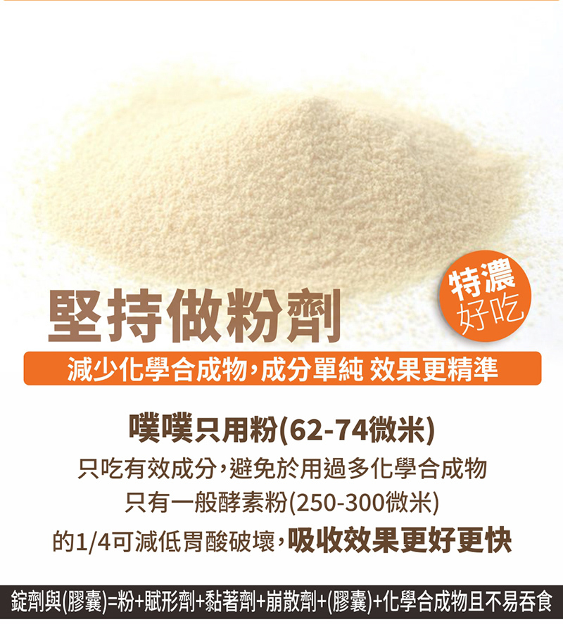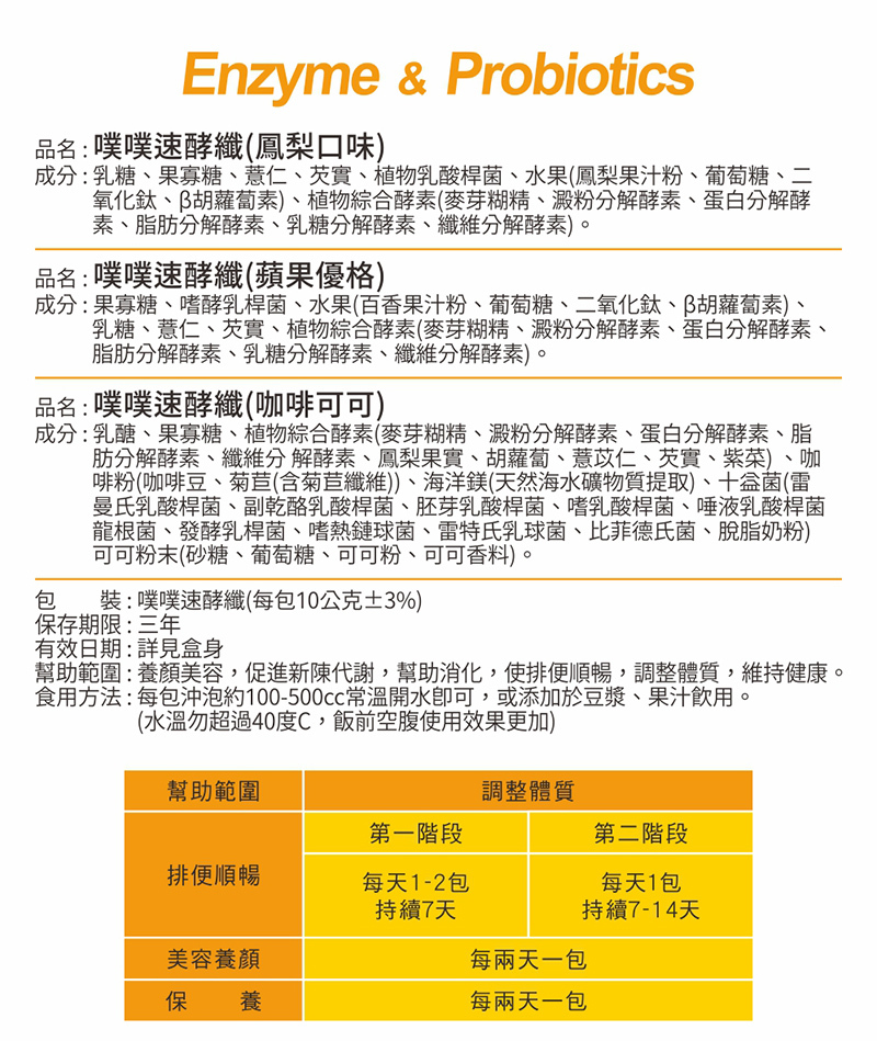 Lactose 乳醣、FOS 果寡糖、Yogurt powder 優格粉、Plant comprehensive enzymes植物綜合酵素(maltodextrin麥芽糊精, amylolytic enzyme澱粉分解酵素, proteolytic enzyme蛋白分解酵素, lipolytic enzyme脂肪分解酵素, cellulolytic enzyme纖維分解酵素, pineapple fruit鳳梨果實, carrot胡蘿蔔, coix seed薏苡仁, gorgonian芡實, seaweed紫菜)、Apple Mixed Juice Powder 蘋果綜合果汁粉 (Composite Apple Juice Concentrate綜合蘋果濃縮汁, Maltodextrin麥芽糊精, Citric Acid檸檬酸, Flavor香料)、Marine Magnesium (Natural Seawater Mineral Extract) 海洋鎂 (天然海水礦物質提取)、Lactobacillus rhamnosus B5K1 雷曼氏乳酸桿菌、L paracasei 副乾酪乳酸桿菌、L plantarum 胚芽乳酸桿菌、L acidophilus BB5 嗜乳酸桿菌、L salivarius 唾液乳酸桿菌、Bifidobacterium longum 龍根菌、L fermentum 發酵乳桿菌、Streptococcus thermophilus ST1 嗜熱鏈球菌、Lactococcus lactis subsp. Lactis 雷特氏乳球菌、Bifidobacterium bifidum 比菲德氏菌、脫脂奶粉、Streptococcus thermophilus ST1, Streptococcus thermophilus, Lactococcus lactis subsp. Lactis rett,Bifidobacterium bifidum, skimmed milk powder) 甜橙萃取、Sweet Orange Extract 芭樂葉萃取、Guava Leaf Extract 山竹萃取、Mangosteen Extract 專利香檬汁粉、(香檬汁精萃取粉、麥芽胡精)