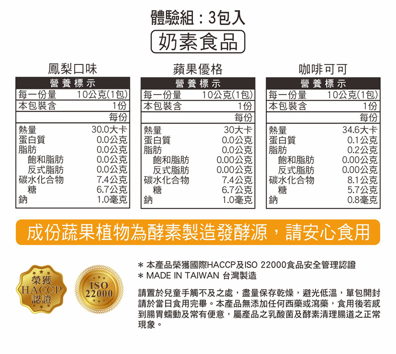 乳醣、果寡糖、植物綜合酵素(麥芽糊精、澱粉分解酵素、蛋白分解酵素、脂肪分解酵素、纖維分 解酵素、鳳梨果實、胡蘿蔔、薏苡仁、芡實、紫菜)、咖啡粉(咖啡豆、菊苣(含菊苣纖維)、海洋鎂(天然海水礦物質提取)、十益菌